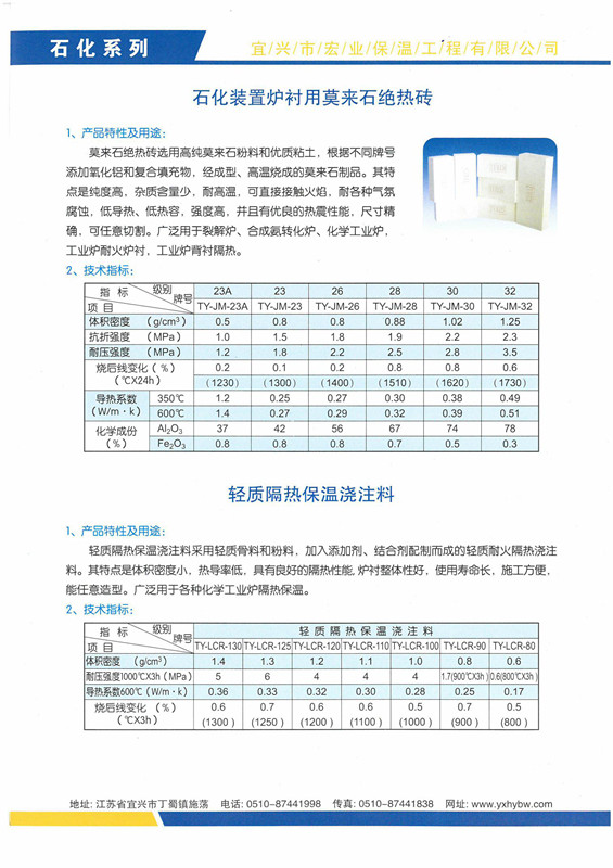 石化裝置爐襯用莫來石絕熱磚、輕質隔熱保溫澆注料